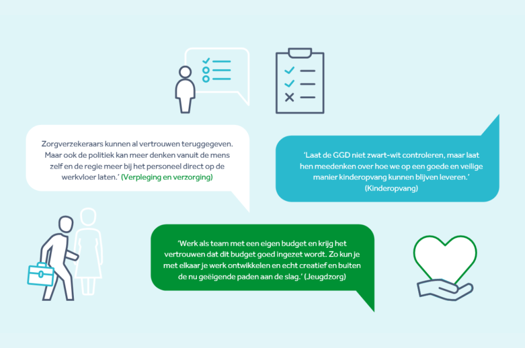 Werknemers ervaren een kloof tussen hun eigen leefwereld en de systeemwereld van hun werk. Werknemers vragen om andere, nieuwe vormen van samenwerking waarin het vertrouwen weer centraal staat. Nieuwe vormen van samenwerking vragen ook om korte lijntjes met zorgpartijen en andere systeempartners en andere vormen van toezicht en verantwoording.