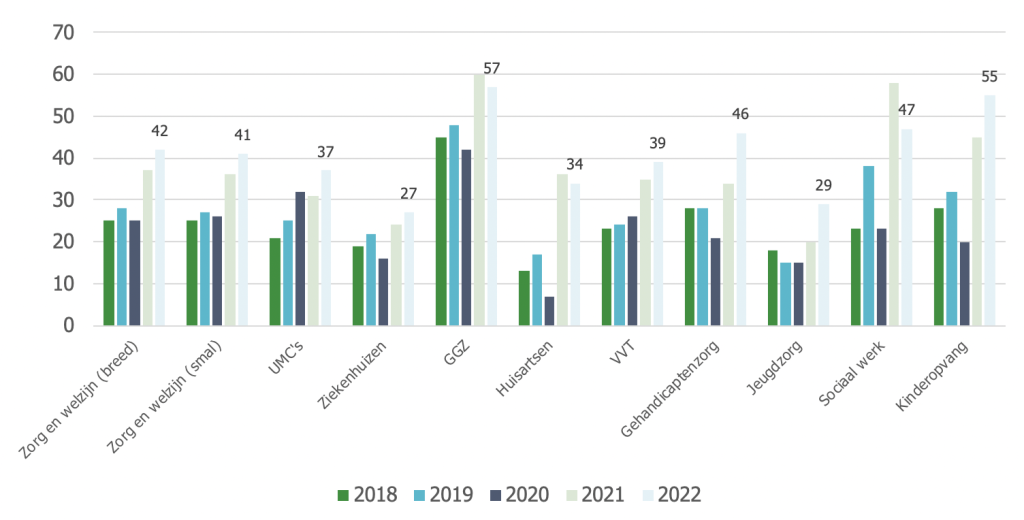 De vacaturegraad is in 2022 opnieuw het hoogst binnen de geestelijke gezondheidszorg (57), al daalde deze wel ten opzichte van 2021 (toen 60 in deze branche). De vacaturegraad steeg in 2022 het hardst in de jeugdzorg (+45 procent, van 20 naar 29), gevolgd door de gehandicaptenzorg (+35 procent, van 34 naar 46). Binnen sociaal werk is sprake van de grootste daling van de vacaturegraad (-19 procent, van 58 naar 47).