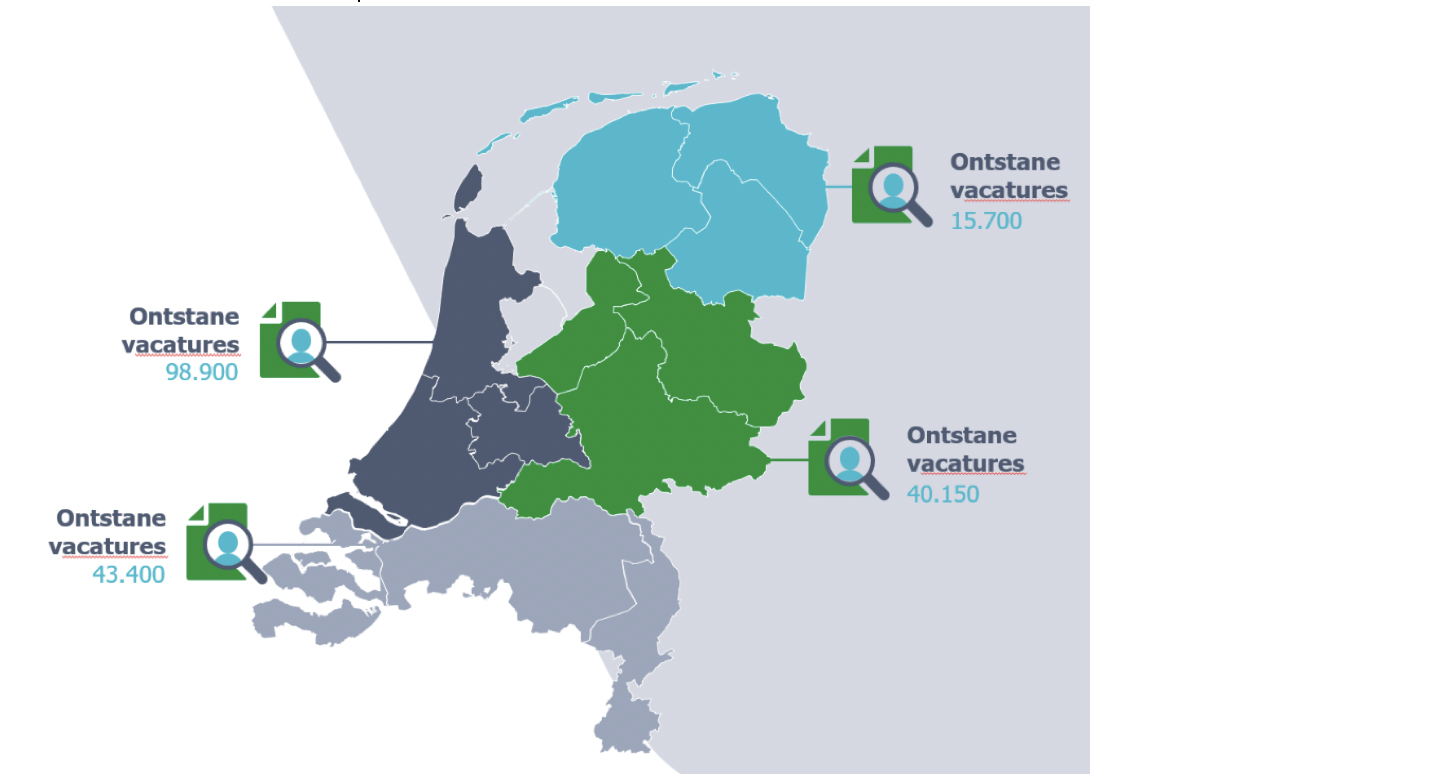 Bij een indeling van Nederland in de vier grote regio’s zien we verschillen in het aantal ontstane vacatures. West-Nederland is met bijna 99.000 ontstane vacatures in 2022 verantwoordelijk voor 46 procent van het totaal. In Noord-Nederland was dit aantal met bijna 16.000 ontstane vacatures het kleinst (7 procent van het totaal). De toename van het aantal ontstane vacatures was in 2022 het sterkst in Zuid-Nederland (+14 procent), gevolgd door Noord-Nederland (+12 procent).
