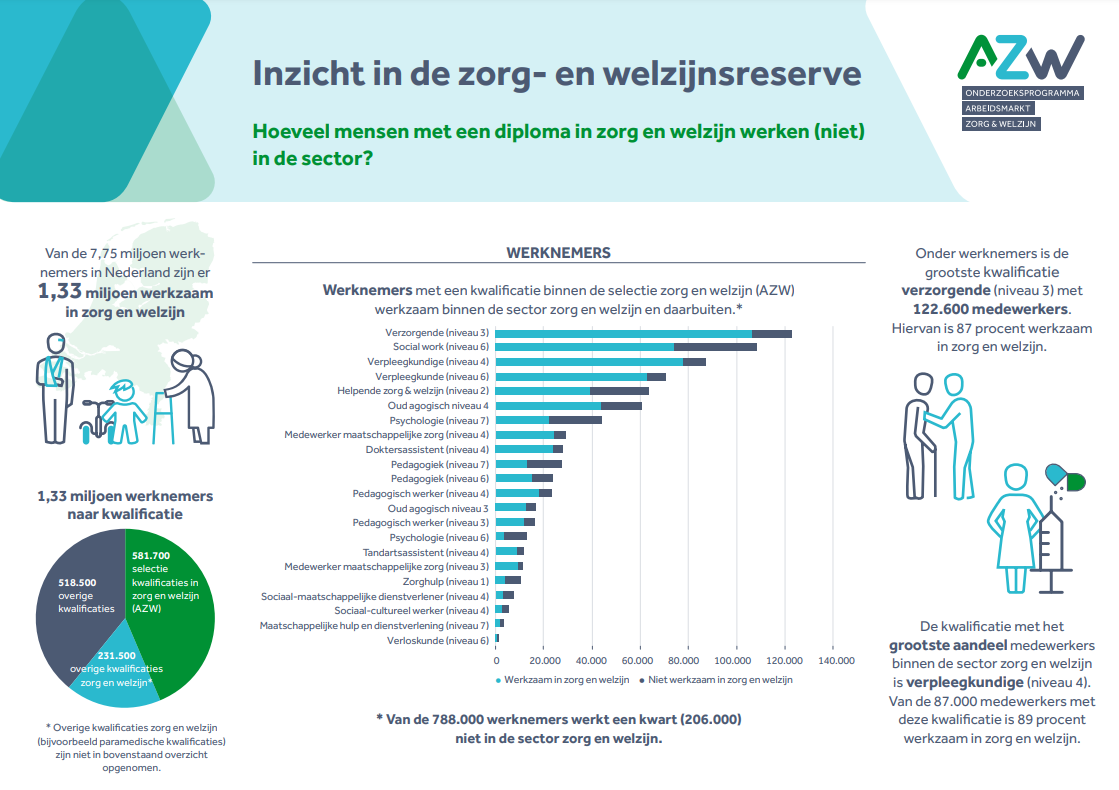 In de infographic ‘Inzicht in de zorg- en welzijnsreserve’ kun je in een oogopslag zien hoeveel mensen met een diploma in zorg en welzijn (niet) in de sector werken. De infographic is gebaseerd op het innovatie-onderzoek dat in 2021 voor het onderzoeksprogramma Arbeidsmarkt Zorg en Welzijn (AZW) is uitgevoerd door het Centraal Bureau voor de Statistiek (CBS). Het doel van dit onderzoek was om zicht te krijgen op de aantallen personen werkzaam binnen én buiten de sector zorg en welzijn naar behaalde kwalificatie. Het onderzoek krijgt een vervolg in 2022. Download hieronder de infographic.